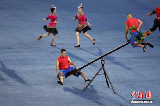 2023年9月23日,在杭州亚运会开幕式仪式前表演中,畲族传统体育项目《稳凳和摇锅》登上舞台。中新社记者 杜洋 摄