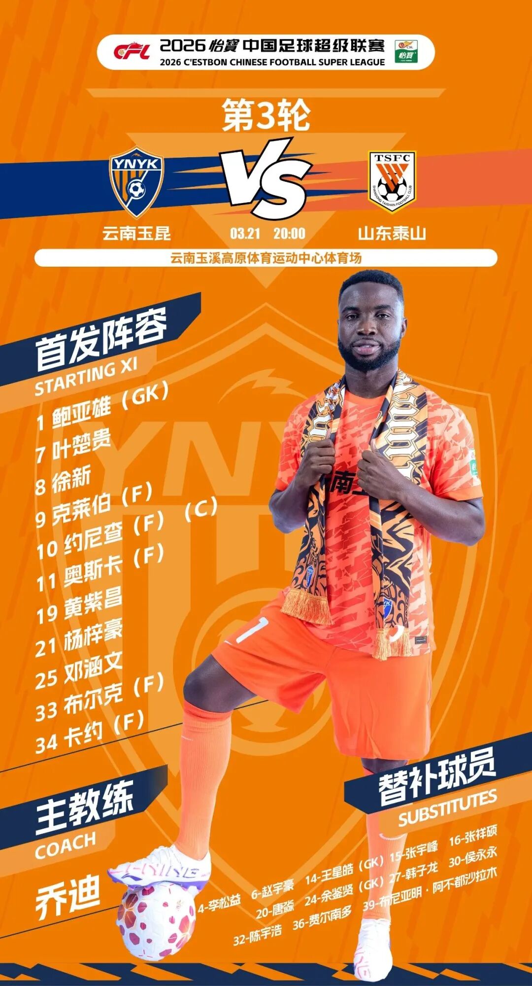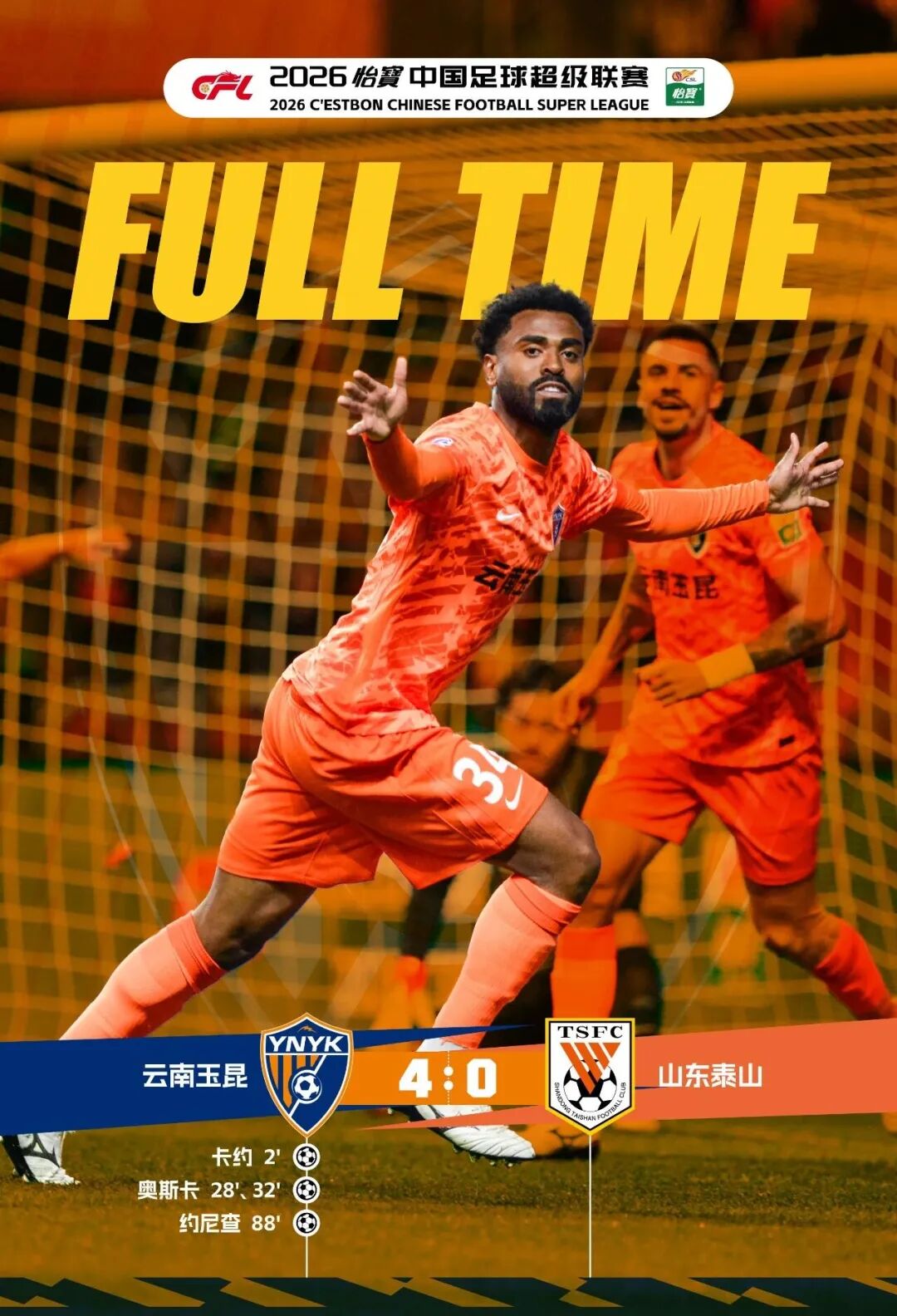 3月21日20:00,中国足球超级联赛第三轮焦点战打响,云南玉昆坐镇玉溪高原体育运动中心体育场,迎战劲旅山东泰山。前两轮赛事中,云南玉昆取得一胜一负的战绩,球队在磨合中逐步寻找节奏,山东泰山则以两连胜完成负分清零,士气正盛,一场备受瞩目的攻防对决就此展开。最终,云南玉昆以4-0大胜山东泰山,继续在中超顶级联赛赛场保持对山东泰山的不败战绩。
