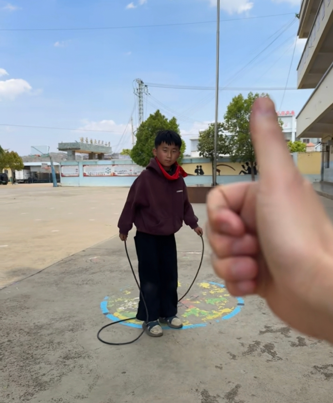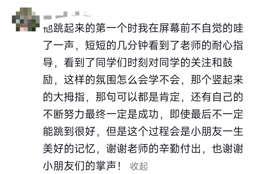 他发现普通跳绳质地偏软,孩子甩不起来、找不到节奏,便特意找来粗软管和硬电线,改成更适合孩子的“专属跳绳”。连续几天午休,他都单独陪着孩子练习。从跳1个、2个,到慢慢连贯,直到孩子终于稳稳地连续跳完10个。那一刻,孩子笑了,全班同学自发围过来鼓掌欢呼。没有嘲笑,没有疏离,只有最纯粹的善意。