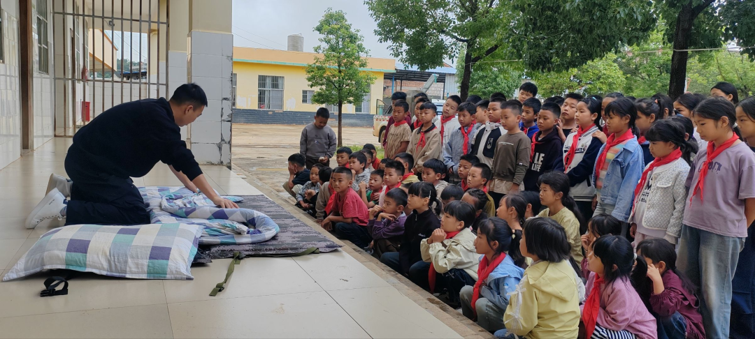 教孩子们叠被子。受访教师陆富川 供图