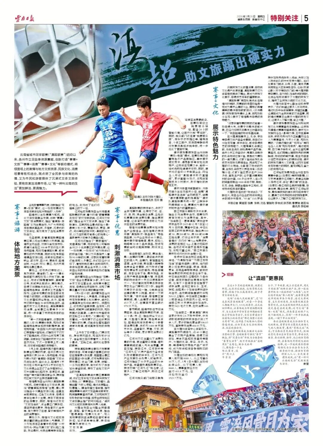 云南省城市足球联赛(“滇超联赛”)启动以来,各州市立足自身资源禀赋,创新打造“赛事+文旅”“赛事+消费”“赛事+文化”等联动模式,将绿茵场上的激情与地方文旅资源、民族文化、消费场景等有机结合,既点燃了全民参与体育的热情,又为市民和游客提供了沉浸式文体文旅体验,更有效激活消费市场,让“有一种叫云南的生活”更加鲜活、更具魅力。