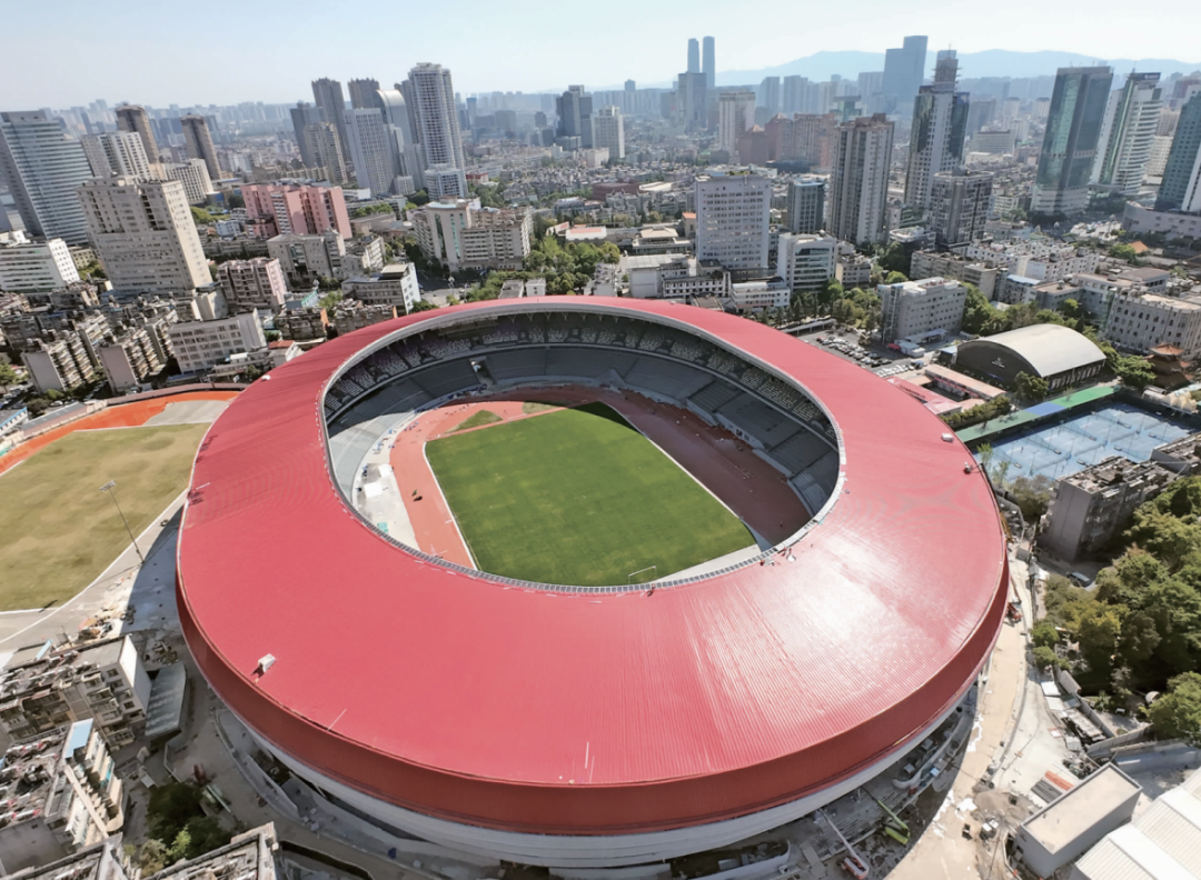 3月27日,拓东体育场环形场顶已铺设完毕,白墙与红顶在昆明的蓝天下格外引人注目。完工后,整个场馆将拥有约4万个座位、26个疏散通道,能够满足专业体育赛事、全民健身和文娱活动需求。值得一提的是,座椅将采用蓝花楹主题配色,北通道两侧新种植了32株蓝花楹,彰显昆明城市特色。