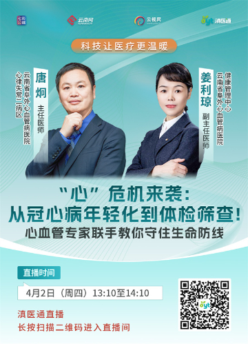 冠心病到底有多危险?它和心梗、猝死有什么关系?为什么年轻人也会得冠心病?常规的体检报告单显示正常,为什么还会突发心梗?4月2日(周四)13:10至14:10,专家做客滇医通直播间为您解答,欢迎扫码观看。