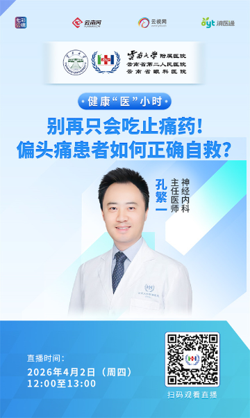 怎么区分是偏头痛还是普通头痛?吃止痛药会不会上瘾?除了吃药,平时要吃什么才能少发作?4月2日(周四)12:00至13:00,专家做客滇医通直播间为您解答,欢迎扫码观看。