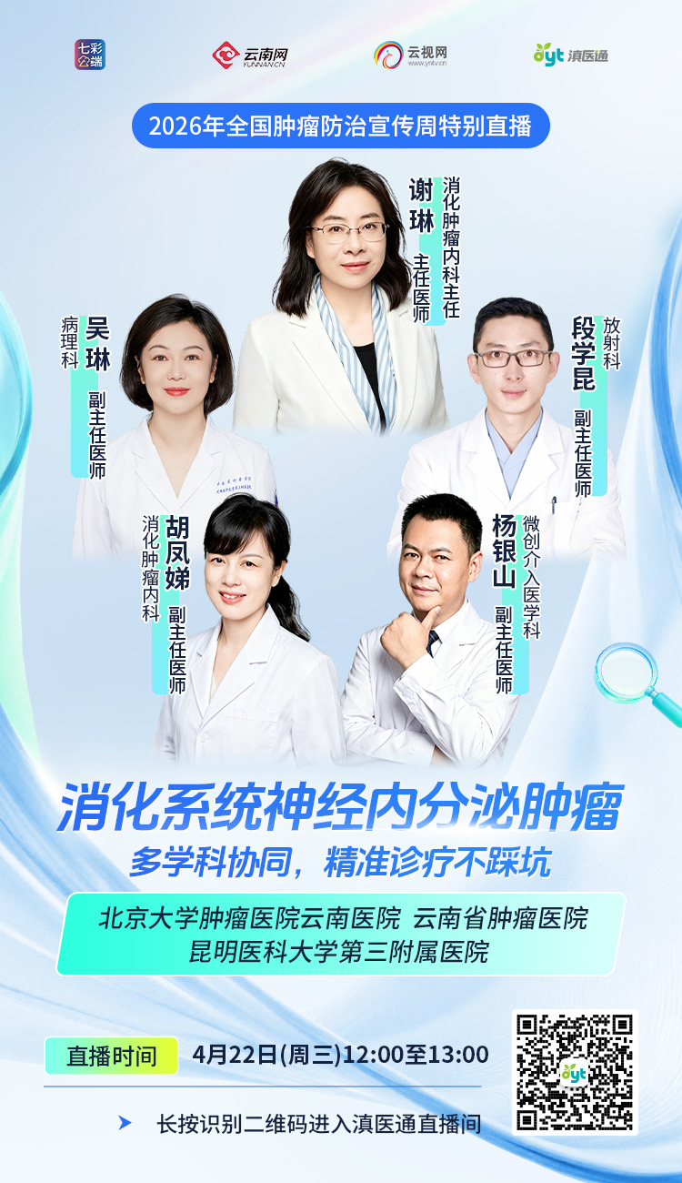 4月22日(周三)12:00至13:00,专家做客滇医通直播间为您解答,欢迎扫码观看。