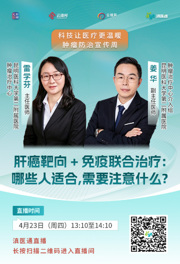 在当前的肝癌诊疗中,“靶向+免疫+介入”联合治疗具体指什么组合?它主要针对哪一类患者?4月23日(周四)13:10至14:10,专家做客滇医通直播间为您解答,欢迎扫码观看。