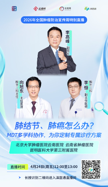 肺结节分哪些类型?哪种更容易发展成肺癌?哪些肺结节要立刻手术?哪些可以观察?什么是肺结节肺癌多学科诊疗(MDT)?和普通诊疗有什么区别?4月24日(周五)12:00至13:00,专家做客滇医通直播间为您解答,欢迎扫码观看。