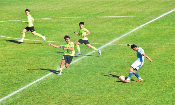 距离国境线5公里,一片人工草皮铺成的足球场上,几十个孩子正以四人一组列队带球奔跑,球衣、短裤、球鞋,配合灵活跑动的姿态,俨然一支成熟球队的“微缩版”。