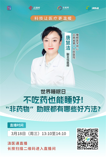 世界睡眠日:不吃药也能睡好!“非药物”助眠都有哪些好方法?3月18日(周三)12:00至13:00,云南省第一人民医院专家做客滇医通直播间为您解答,欢迎扫码观看。