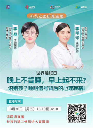 晚上不肯睡,早上起不来?识别孩子睡眠信号背后的心理疾病!3月20日(周五)13:10至14:10,云南省心里卫生中心专家做客滇医通直播间为您解答,欢迎扫码观看。