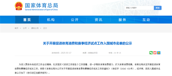 为深入贯彻中央经济工作会议精神,扎实落实《政府工作报告》工作部署,进一步释放体育消费潜力、扩大体育消费规模,体育总局决定开展促进体育消费和赛事经济试点工作。按照《体育总局办公厅关于开展促进体育消费和赛事经济试点工作的通知》(体经字〔2024〕631号),经评审,现将入围城市名单公示如下(按行政区划顺序排列):