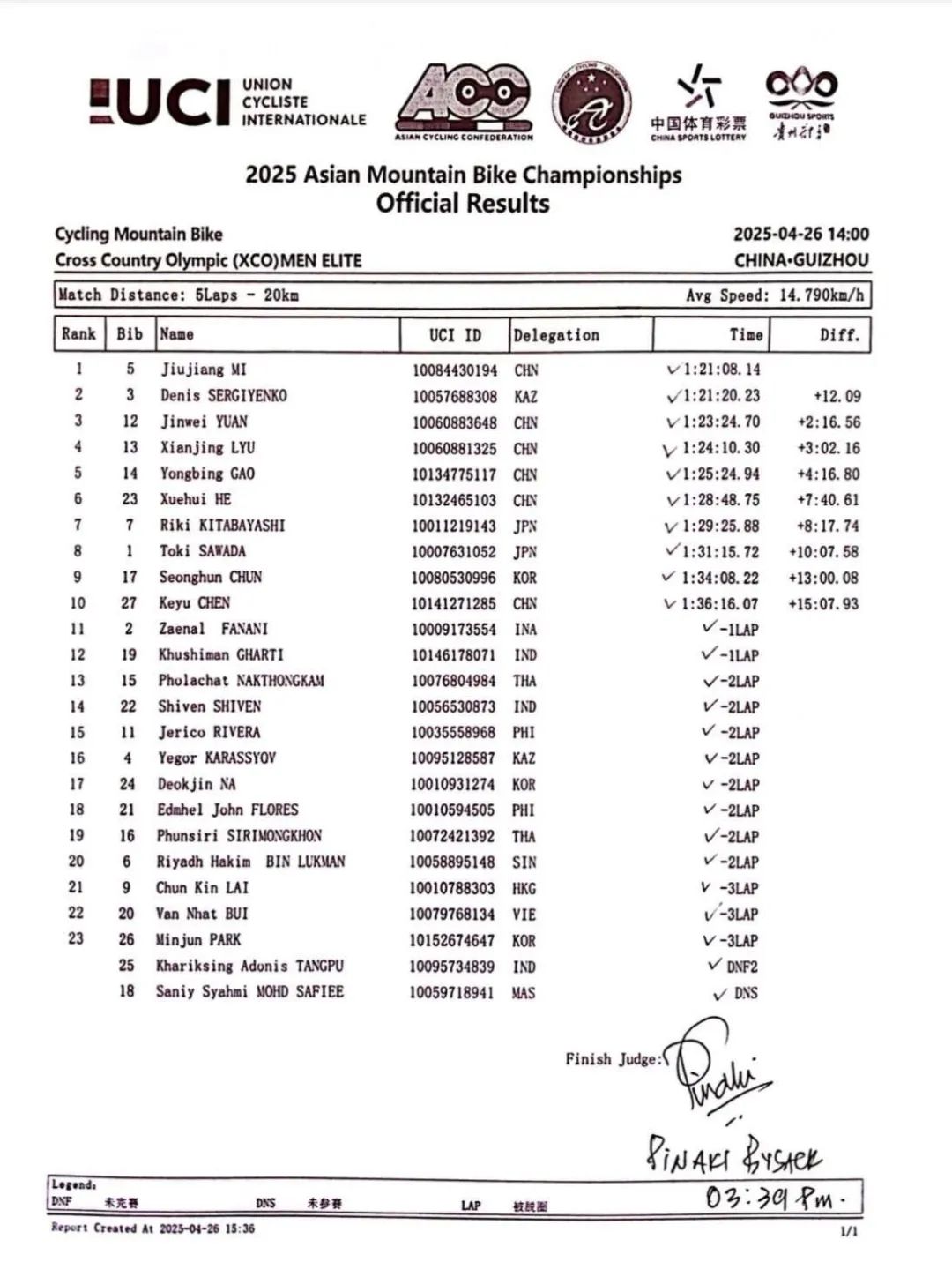 4月26日,2025亚洲山地自行车锦标赛在遵义结束了男子精英越野赛的争夺,中国车手吕先景在比赛中克服重重困难,取得了第四名的佳绩。