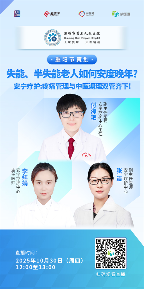 什么是安宁疗护?失能老人适合吗?老人可以在安宁疗护中心住多久?有长护险吗?失能老人常见疼痛问题如何管理?中医在安宁疗护中能起什么作用?10月30日中午12点至13点,昆明市第三人民医院安宁疗护中心专家团队做客直播间,云南广播电视台七彩云端APP、云视网、云南网同步直播!