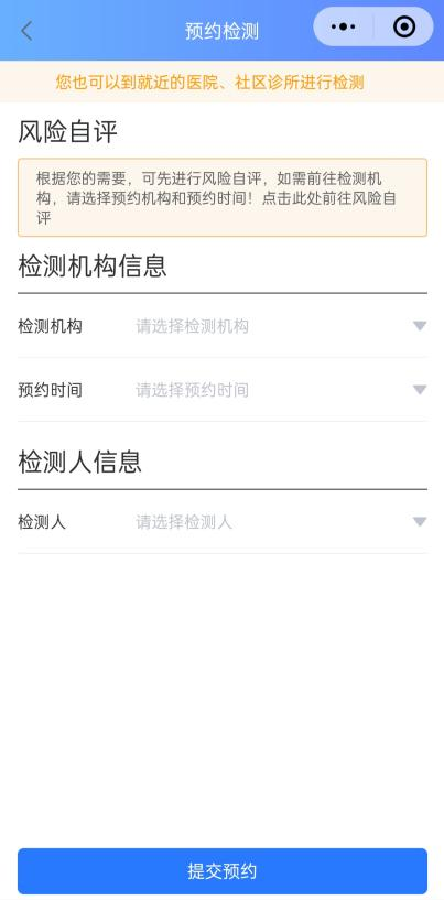 点击小程序“检测预约”模块,选择检测机构、预约时间,提交申请后,按预约时间前往机构检测即可,预约和检测服务都是免费的。若不想线上预约,也可通过“查看附近检测机构”功能,依据导航自行前往咨询检测。