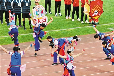 夜幕降临,开幕式在激昂的旋律中正式开始。各州(市)展示方阵依次迈着矫健的步伐登场,当红河州方阵踏着铿锵的节奏走过主席台时,全场掌声雷动。队员们精神抖擞,队旗迎风招展,尽显红河儿女奋发向上的精神风貌。行至主席台前方,展演人员伴着轻快的旋律散开,舞蹈《马缨花》轻盈绽放,举手投足间传递出红河儿女积极向上、团结奋进的精神风貌。