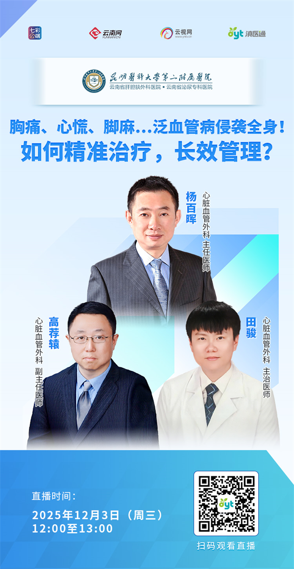 什么是“泛血管”疾病?它与传统的心血管病有什么不同?腿上血管堵了(外周动脉疾病)和心脏血管堵了,是同一种病吗?它们之间有什么关联?哪些腿部不适的症状需警惕是外周血管疾病,而不是简单的“老寒腿”或骨质疏松?确诊外周血管疾病,通常需要做哪些检查?12月3日中午12点,昆明医科大学第二附属医院心脏血管外科专家团队做客直播间,欢迎观看。