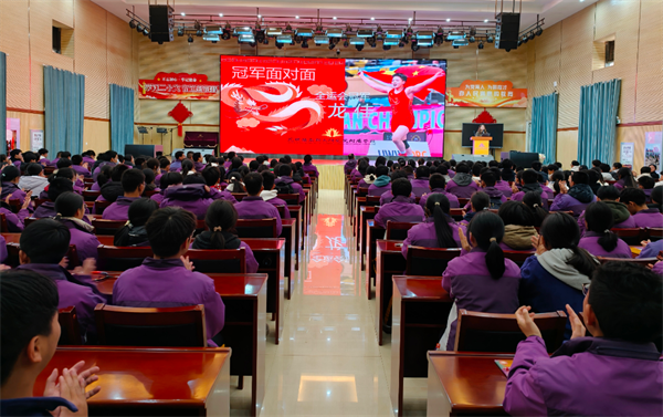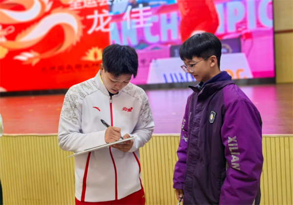 互动环节气氛热烈。面对学生们“比赛中比分落后或紧张怎么办”“如何面对枯燥的训练”等提问,龙佳坦诚回应:“面对比分落后的情况,想起平时教练说的‘不到比赛结束,永远不要放弃’,就会告诉自己再拼一把”“荣耀的背后,是日复一日的苦练”。龙佳还围绕抗挫折能力、如何走出低谷等方面与学生们深入交流。
