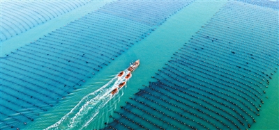 1月27日,山东省荣成市爱伦湾海洋牧场,养殖工人驾驶船只收获小海带,投放各地春节市场。