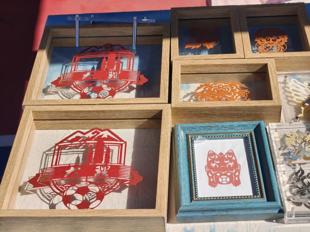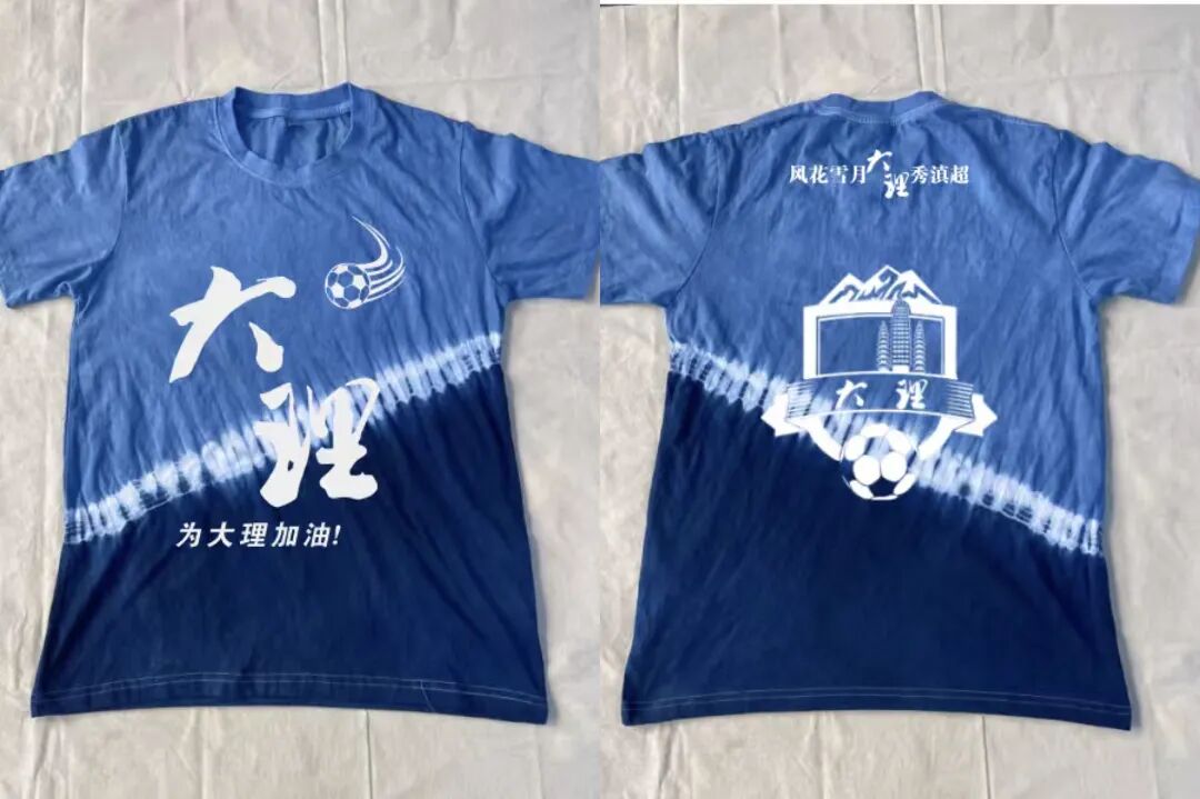大理璞真扎染的展位前,马年生肖玩偶等扎染产品热销,不少学生还购买了扎染的球迷应援T恤。这款由庆小庆工作室设计、璞真扎染制作的球迷服,让赛场涌动着一片“大理蓝”,也将大理的文化底蕴展示给八方宾朋。白族扎染技艺州级代表性传承人杨志瑞介绍:“目前我们已经制作了3个批次、2000多件T恤。首批生产时,我们位于喜洲镇周城村的染坊中,100多位手艺人在4天时间里赶制出1000多件衣服,从制版、扎花、染色、晾晒全程采用手工制作。”