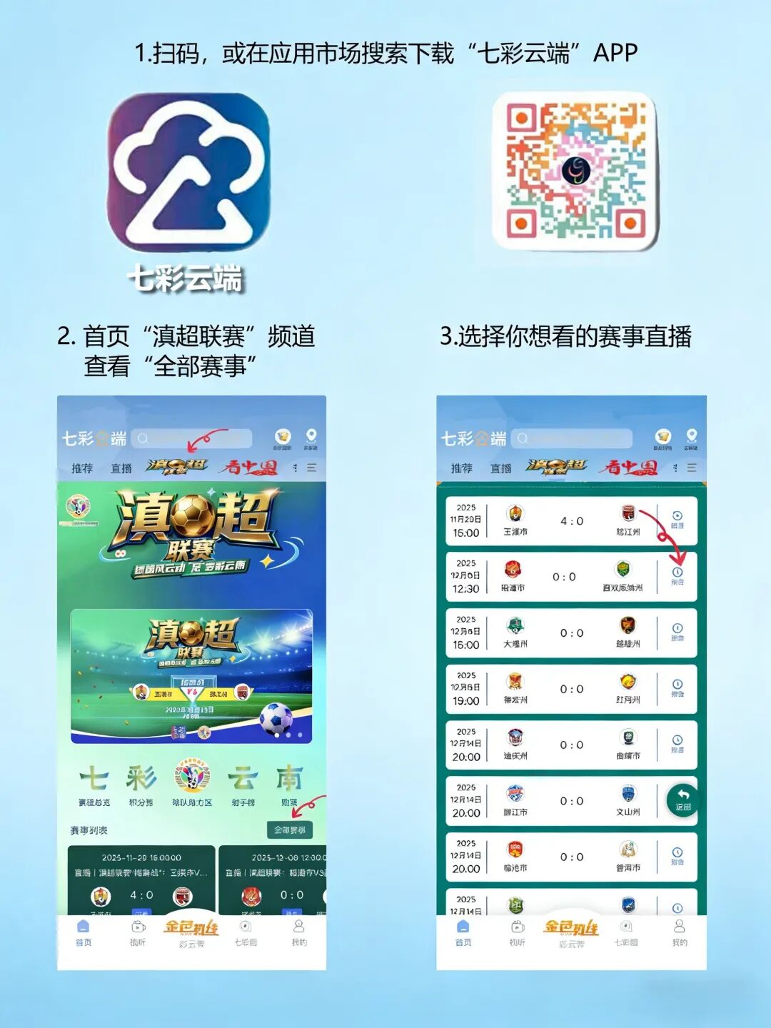 “七彩云端”客户端【“滇超联赛”频道】已上线,128场对决全程直播!不只是观赛平台,更是云南球迷的互动大本营,速来集结,让热爱沸腾!